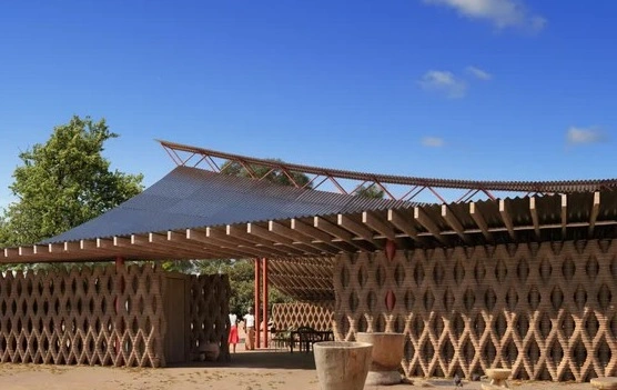 Mái nhà nhô ra ở trung tâm cộng đồng Tanzania cũng đóng vai trò quan trọng trong việc bảo vệ các bức tường khỏi tác động xói mòn của mưa. Công ty Hassell cho biết họ được khuyến khích khi đến thăm dự án TOVA năm 2022 của IAAC, tòa nhà đầu tiên được in công nghệ in 3D và đất địa phương của Tây Ban Nha. Những bức tường này thực sự đã tồn tại trong một thời gian rất dài.