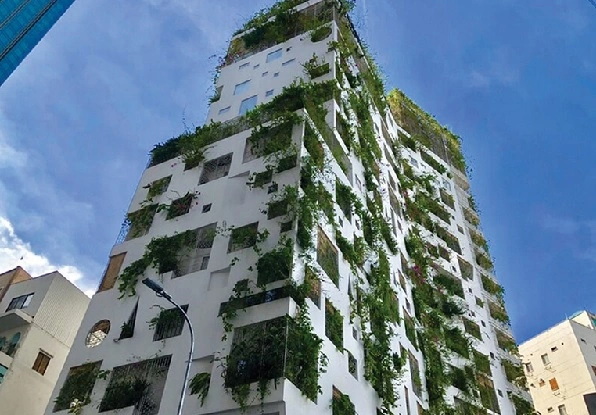 Một khách sạn theo khái niệm kiến trúc xanh trên đường Hồ Huấn Nghiệp, quận 1, TPHCM. Nhiều công trình xanh tại Việt Nam không chỉ tăng không gian xanh, mà còn sử dụng vật liệu xanh và kiến trúc xanh nhằm giảm lượng phát thải, tăng tính bền vững. Ảnh: The Myst