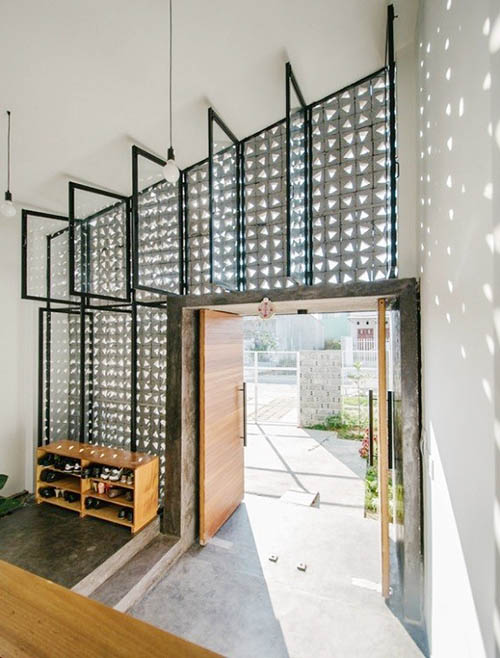 Ngoài ra, gạch thông gió là vật liệu đẹp và hiệu quả cho nhà mặt tiền đường phố chính, giúp cản bớt khói bụi, ánh sáng chiếu trực tiếp vào trong nhà. Nó còn là không gian đệm trước khi vào nhà, làm đẹp mặt tiền.