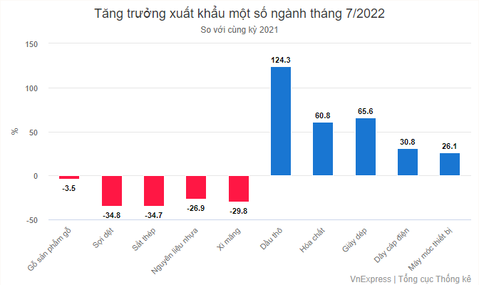 Một số mặt hàng ghi nhận tăng trưởng tích cực trong nửa đầu năm đã đảo chiều giảm trong tháng 7 như: gỗ và sản phẩm từ gỗ (-3,5% so với cùng kỳ), sợi dệt (-34,8%), sắt thép (-34,7%), nguyên liệu nhựa (-26,9%), xi măng (-29,8%).