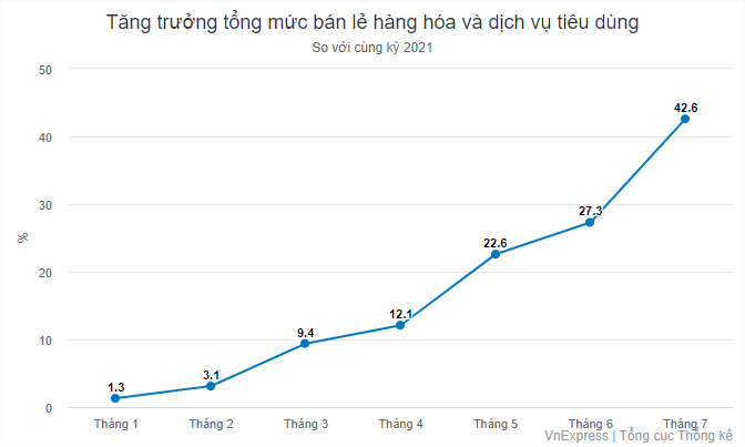 Tuy nhiên, bù lại phần nào cho sản xuất và xuất khẩu giảm tốc, tổng mức bán lẻ hàng hóa và doanh thu dịch vụ tiêu dùng tháng 7 tăng 2,4% so với tháng 6 và tăng 42,6% so với cùng kỳ 2021.