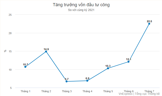 Ngoài ra, để củng cố sức chống chịu trong những tháng còn lại của năm sẽ cần đến đầu tư công lẫn FDI. Theo Tổng cục Thống kê, vốn đầu tư công tháng 7 tăng 22,5% so với cùng kỳ 2021, cải thiện đáng kể so với mức tăng 10,1% của nửa đầu năm.
